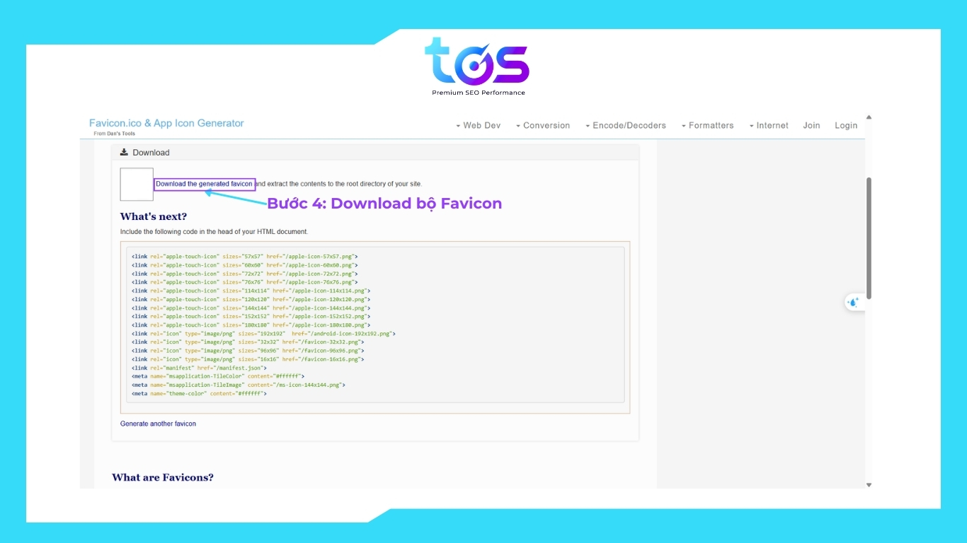 - Bước 7: Sau khi tải ảnh, chọn chức năng tạo favicon (Generate Favicon) để hệ thống chuyển sang trang web Real Favicon Generator, sau đó chọn Generate your Favicon and HTML code.