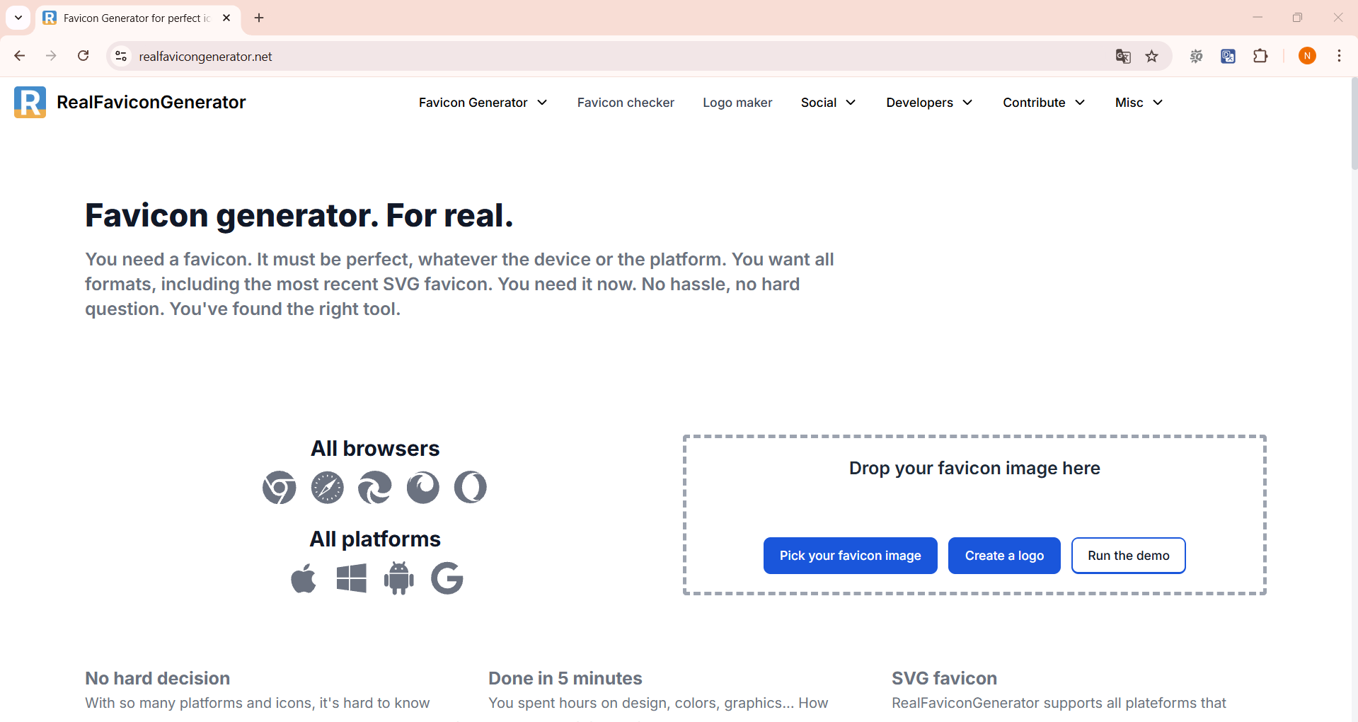 Real Favicon Generator là công cụ tạo favicon hỗ trợ tối ưu hiển thị trên mọi nền tảng, công cụ có cung cấp sẵn mã HTML để chèn vào website.