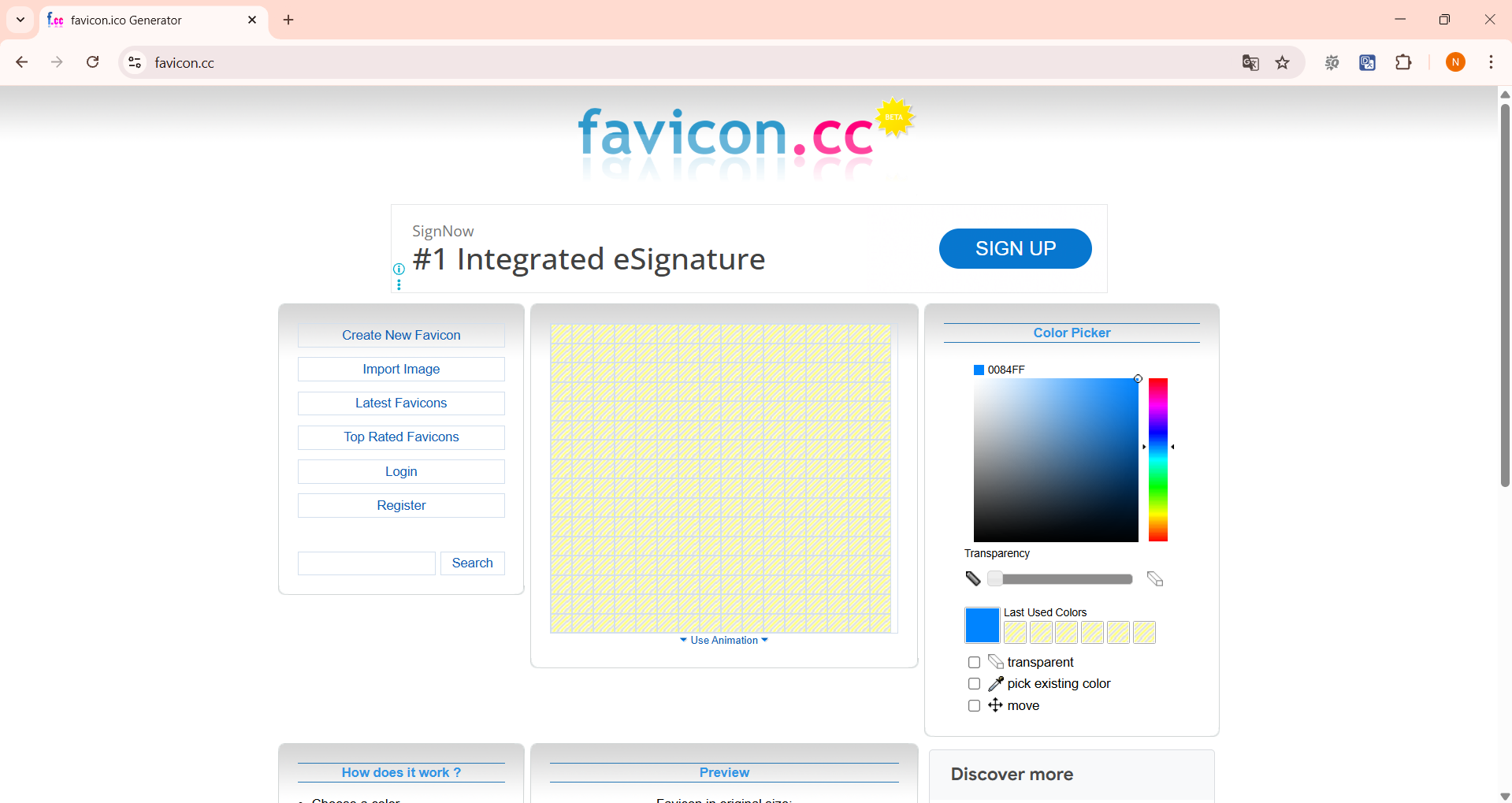 Favicon.cc là công cụ thiết kế favicon theo dạng vẽ pixel trực tiếp trên trình duyệt, cho phép người dùng tự tay chỉnh từng chi tiết nhỏ và có hỗ trợ favicon động.